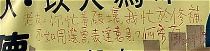 上面寫著:「老友:你忙著破壞,我忙於修補,不如用選票表達意見?」